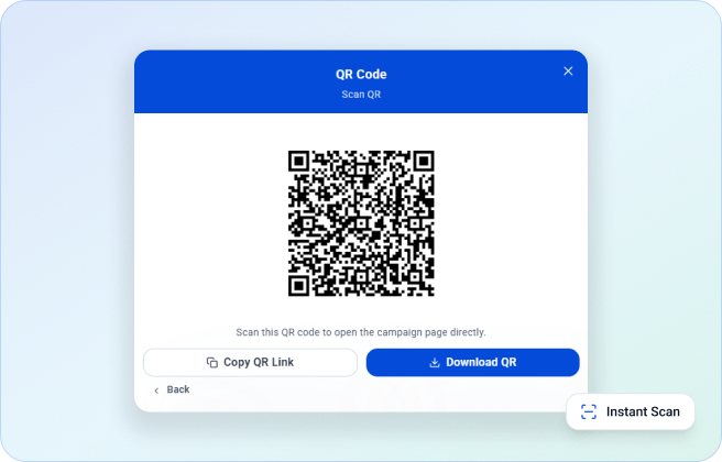 Each campaign gets a unique QR code that donors can scan to land directly on the donation page — perfect for events, flyers, and signage.